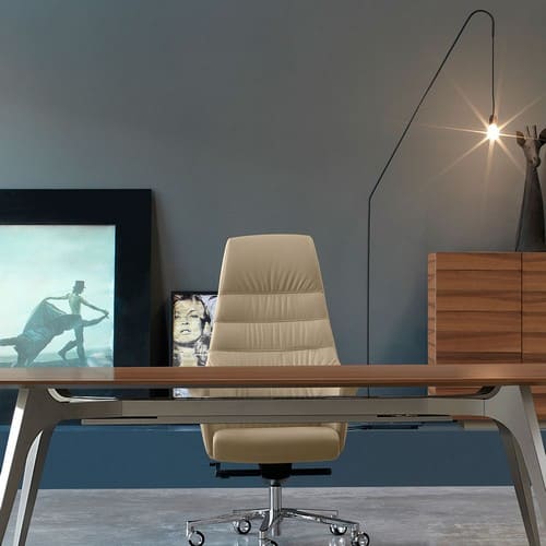 Shuttle è un progetto firmato Silvano Barsacchi che rappresenta l'equilibrio ideale tra innovazione, qualità e comfort e la perfetta unione di sapienza artigianale, design e tecnologia. L'inconfondibile struttura realizzata in metallo finitura titanio ha un aspetto raffinato e glamour per interpretare l'ambiente executive con versatile e dinamica personalità. I piani di spessore sottile sono disponibili in vetro trasparente o impiallacciati in foglia naturale di noce nazionale o per contrapposizione in nobilitato di maggior spessore. La scrivania Shuttle si caratterizza per le ampie dimensioni che fanno si che risulti estremamente rappresentativa e confortevole. Il piano in legno con finitura noce nazionale è caratterizzato da una sezione perimetrale smussata che lo rende esteticamente molto sottile, inoltre la particolare venatura ed il tono cromatico del legno gli conferisce un aspetto molto ricercato e contemporaneo.