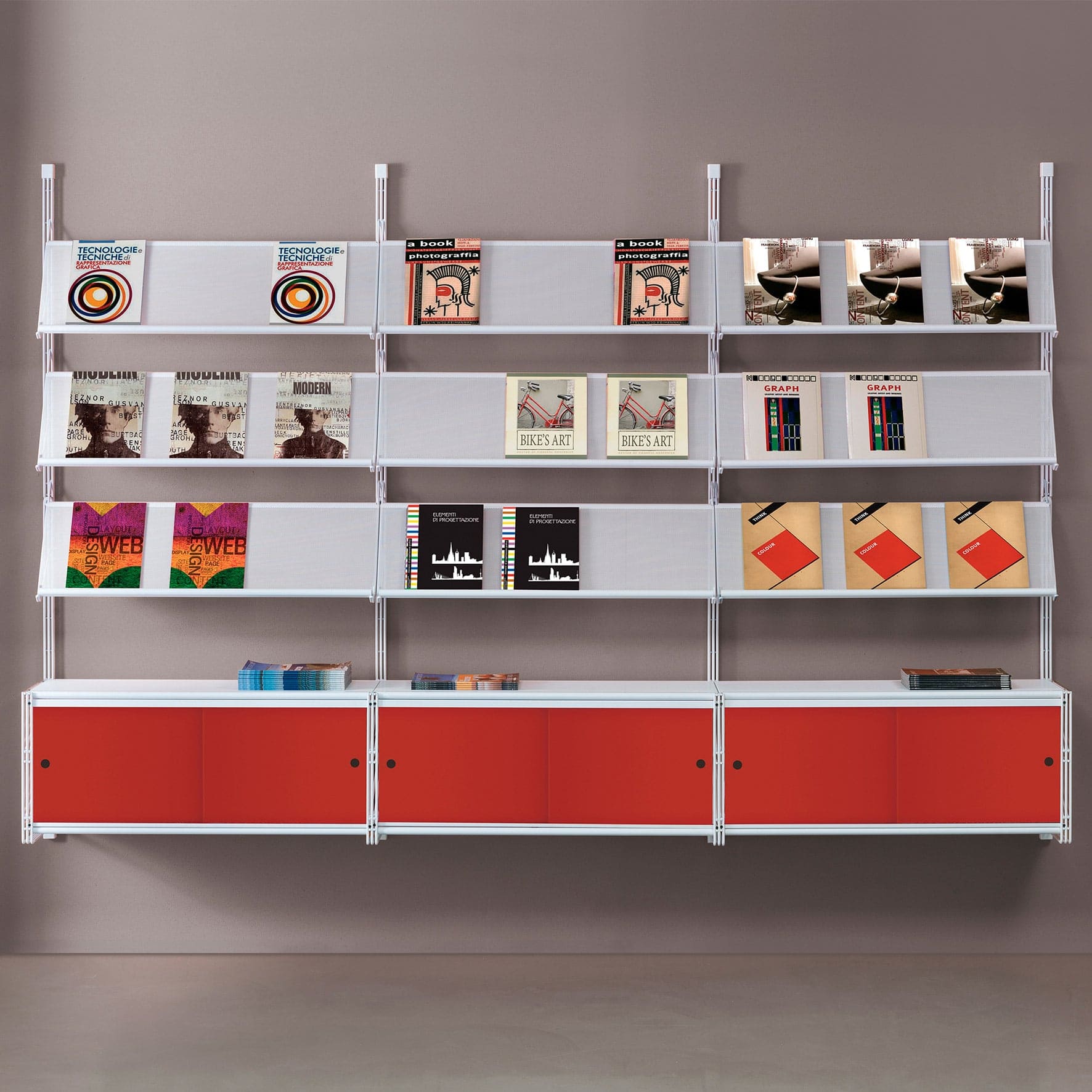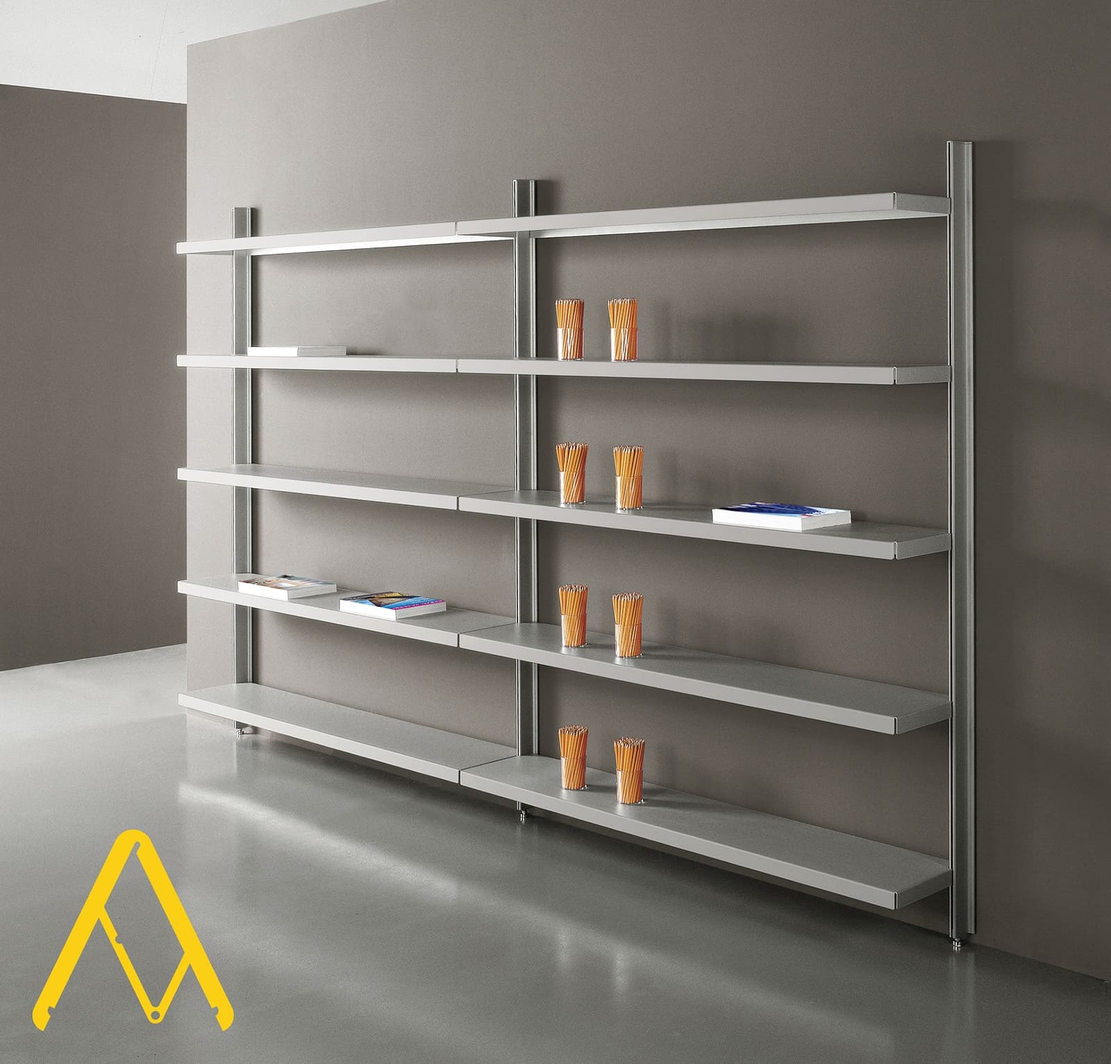 Caimi Socrate display (Espositori, Interiors, Librerie modulari): Socrate è un sistema modulare di librerie con struttura in metallo caratterizzate dall'estrema flessibilità di composizione, adatto a soddisfare diverse esigenze sia in termini di spazio che di stile. Il sistema Socrate è disponibile nella versione autoportante oppure fissato a parete. I ripiani in acciaio pieno o microforato sono realizzati con bordo frontale a doppio spessore arrotondato antiinfortunio. La piegatura laterale permette l'aggancio diretto al montante. I ripiani microforati facilitano la circolazione dell'aria migliorando l'areazione dei libri e riducendo quindi la pericolosa formazione di umidità.
